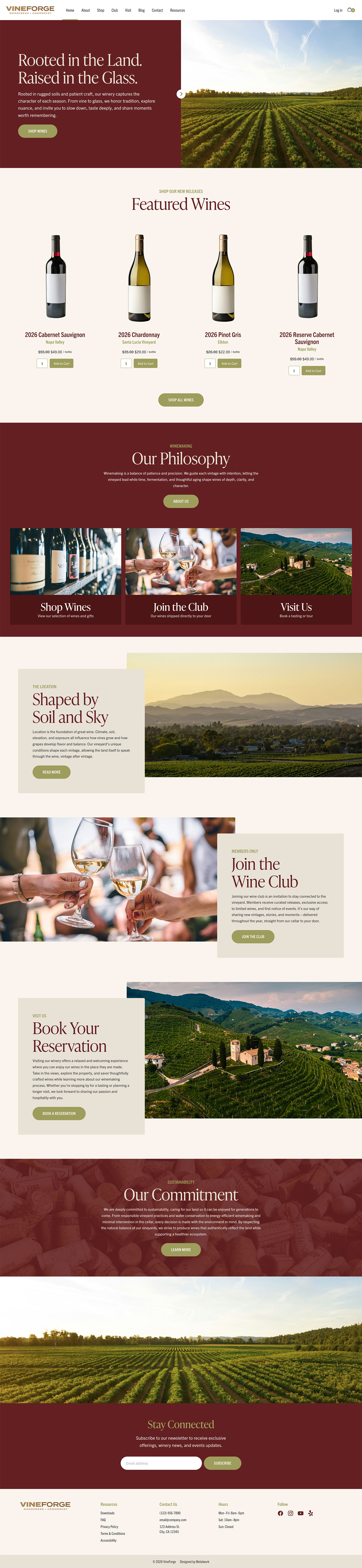 VineForge is a WordPress template built specifically for wineries and small businesses. With interchangeable and stackable content blocks, simple and intuitive editing fields, and built-in Commerce7 integration, VineForge makes it quick and easy to create and customize your perfect website.